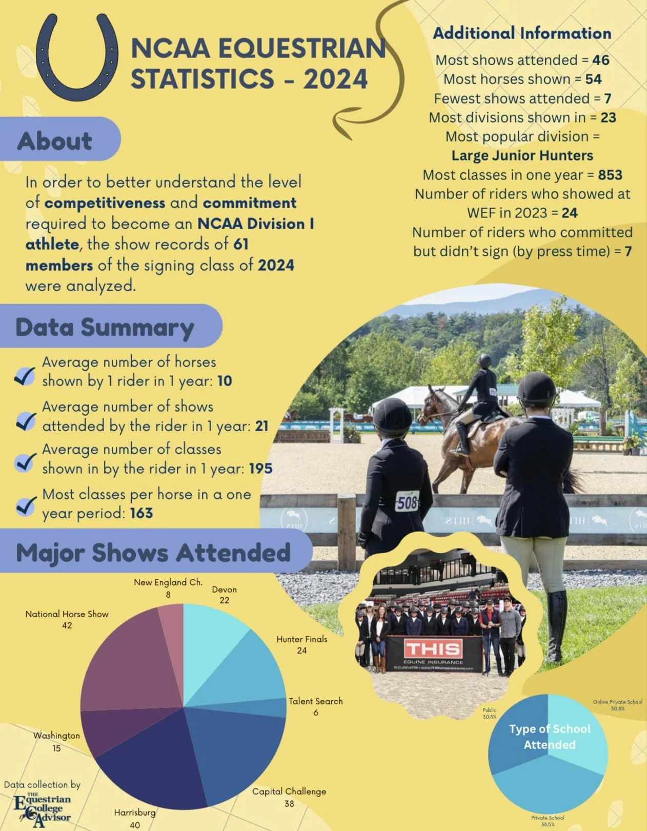 Now, just because the skill level to compete in the NCEA is low, it doesn’t mean that the riders competing in it aren’t more skilled, and based on the stats published, most riders are quite a bit more skilled. According to the Plaid Horse, all D1 Athletes in the signing class of 2024 attended an average of 21 shows a year, with many attending expensive, elite shows (66% attended medal finals at Harrisburg). The cost of these shows is extraordinary. They can be upwards of $10,000/show (but likely much more). I would like to note that show costs vary depending on your location, how far you have to travel, and other factors, such as whether you rent a horse for year-end finals. So, it could be less, it could be more, but I can't imagine, even if it were done cheaply, that anyone would spend less than $5,000 to attend any one of these shows. The fewest shows one rider attended was 7, which would likely rack up a bill of at least $7,000/year if they were all local, smaller, and maybe unrated shows. The most popular division for these riders was the large junior hunters, which now have two divisions competing at either the 3.3” or the 3.6” (it used to only be the 3.6” only, but apparently that’s changed).